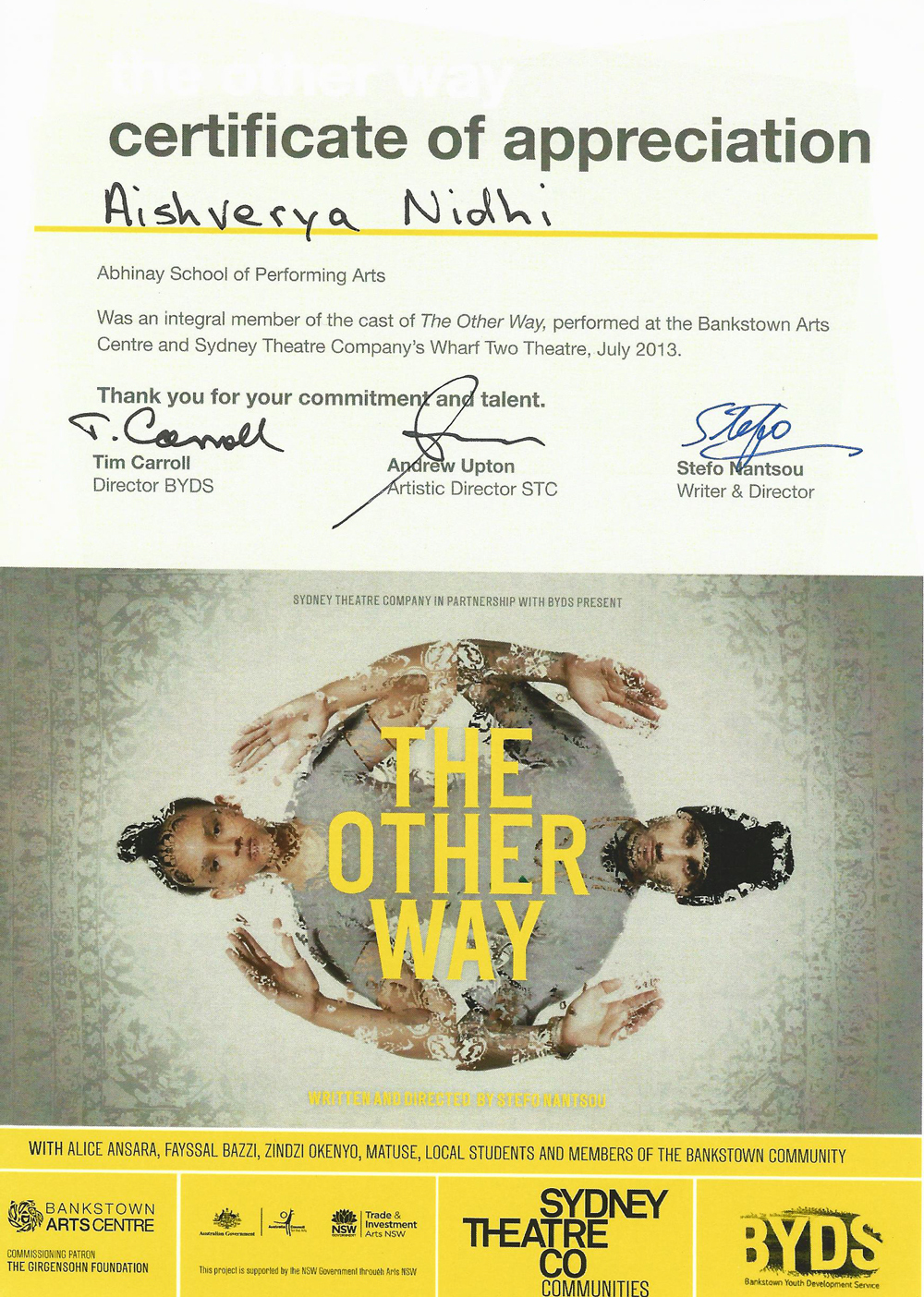 Hats off to Aishverya Nidhi, President – Abhinay School of Performing Arts, for having the vision of connecting Indian and Australian theatre, opening doors for so many budding enthusiasts in this field, enriching their skills and taking Abhinay School to soaring heights thorough her sheer passion and hard work.